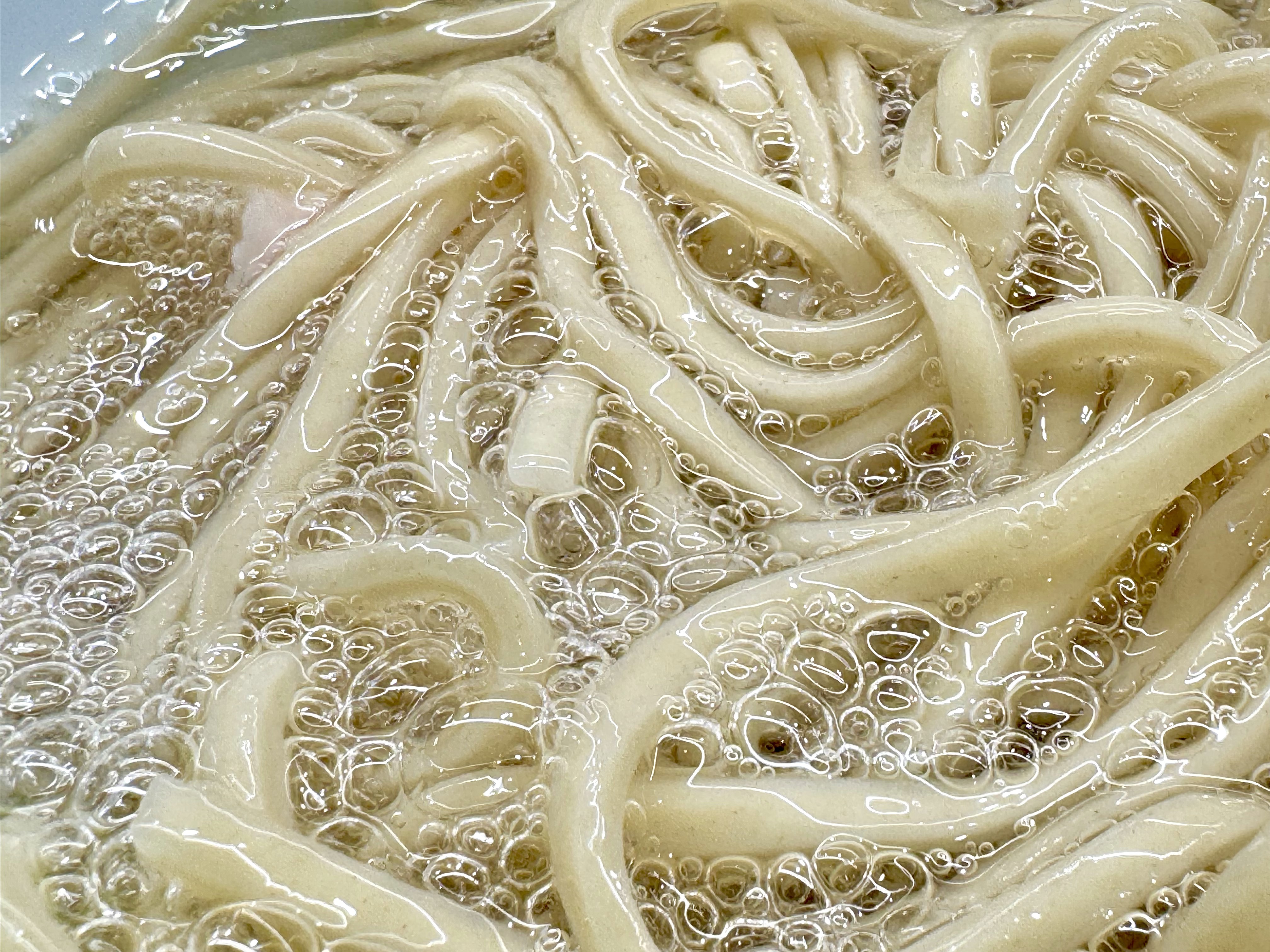 麺は途中から泡立てるように混ぜると、空気が入り麺がふんわり食感になって行く。ちょっとした風味の変化に良いです。