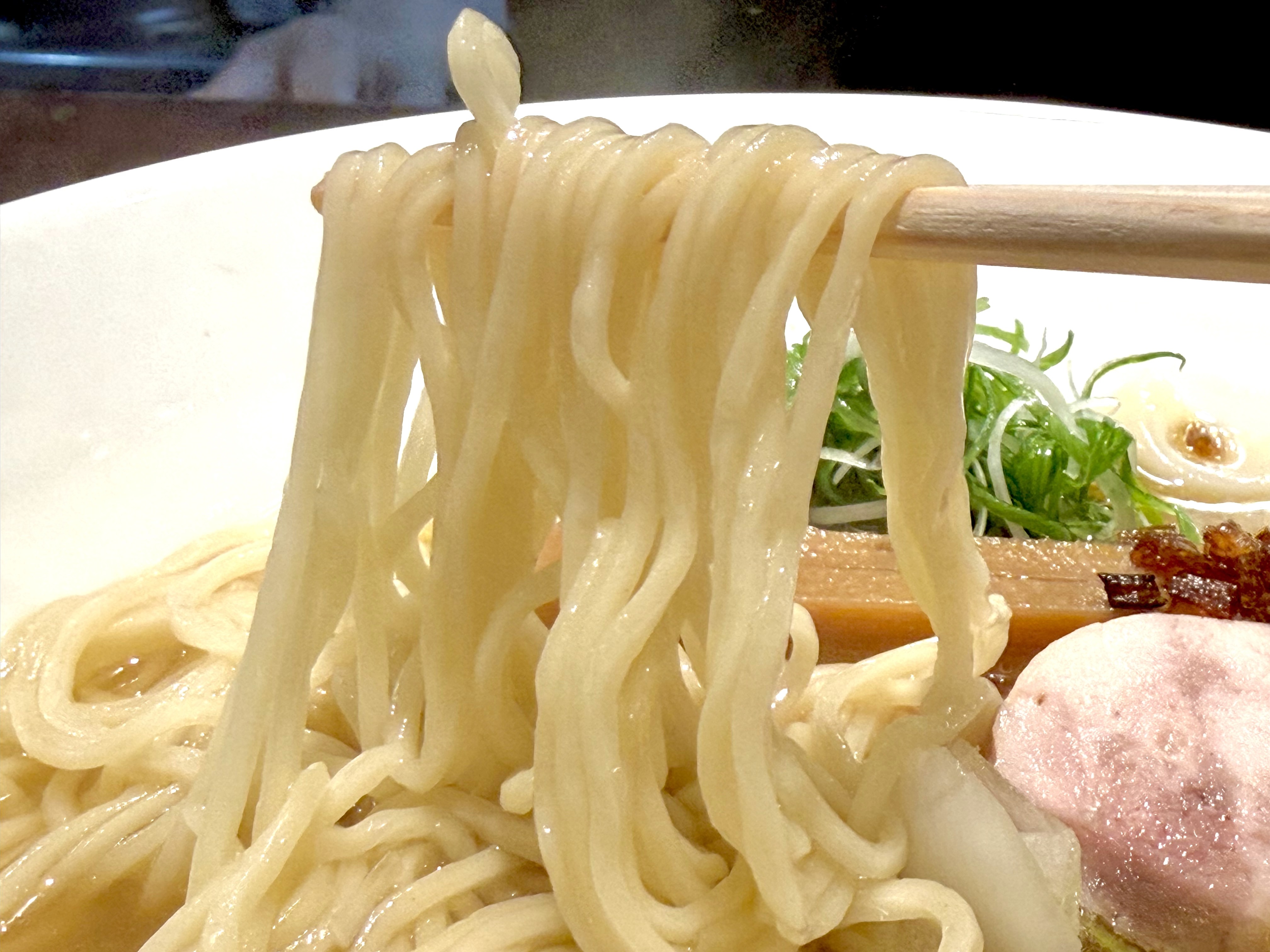 麺は国産小麦から自家製麺した中細麺。写真からも見える印象の通りやや柔らかで滑らか。適度なコシのある美味しい麺で、スープとの一体感もお見事。